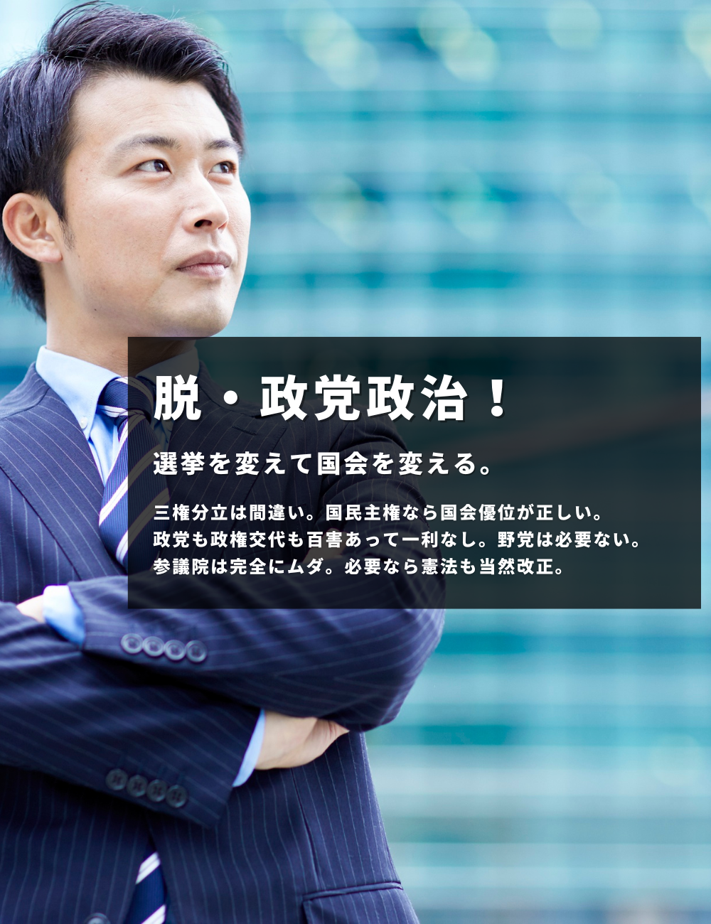 - 地方議会を廃止し、予算編成・条例制定を首長の権限とします。